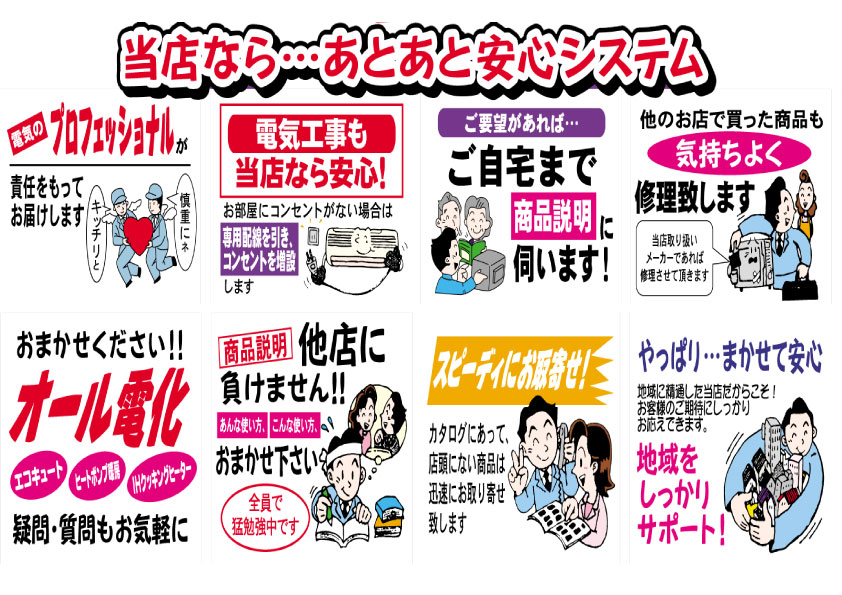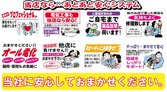 当社では、各種家電の販売も行っております。 ただ、販売というだけではなく、配達、取付、修理などのアフターケアまで、 総合的なサービスを行っていますので、安心してご購入ください。